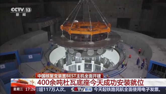 10月1日上午完成吊装的杜瓦底座是BEST装置主机的首个真空大部件,也是国内聚变领域最大的线余吨,是BEST主机系统中最重的部件,将位于整个BEST主机的最底端,用来承载总重约6700吨的主机。